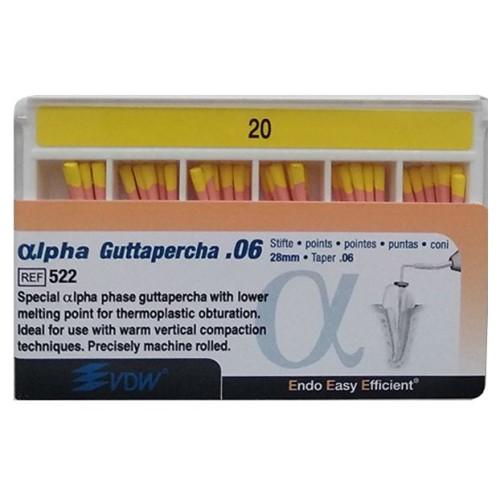 ОПИСАНИЕ: АЛЬФА ГУТТАПЕРЧА (ALPHA GUTTAPERCHA) №20 06 L28, VDW (ГЕРМАНИЯ) Гуттаперчевые альфа штифты, используются для постоянного пломбирования корневых каналов методом термопластической обтурации, имеют низкую температуру плавления, сделаны из гомогенной, биосовместимой, натуральной гуттаперчи, обладают высокой стабильностью и гладкой поверхностью для легкого введения в канал, практичная слайдкассета с поролоновой вставкой, предотвращает выпадение штифтов. ХАРАКТЕРИСТИКИ Размер (size): 020 Длина (length): 28 мм Конусность (taper): 06 ПРЕИМУЩЕСТВА Идеально для использования с BeeFill 2 в 1, BeeFill Pack и т.д. С низкой температурой плавления По стандарту ISO Практичная слайдкассета с поролоновой вставкой, предотвращает выпадение штифтов. УПАКОВКА 60 шт.