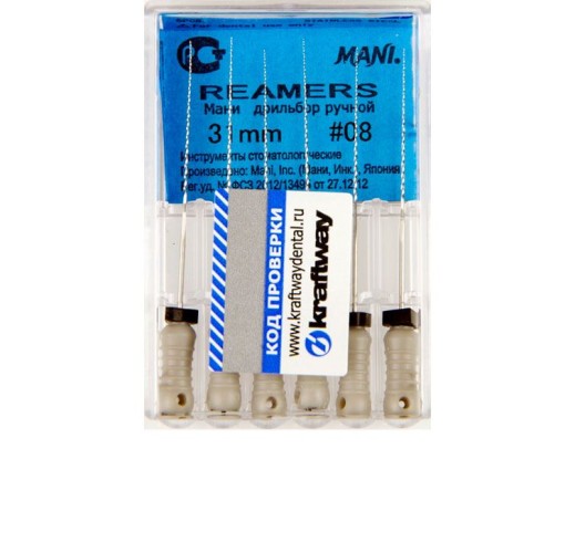 Ример № 8 Mani – эндодонтический инструмент, с помощью которого проходится зубной канал для его очистки и расширения перед промывкой и герметизацией. Гибкость и прочность, при длине 31 мм, позволяет работать с каналами сложной конфигурации. В римерах № 8 применяется спиралевидная рабочая часть, сделана из специальной нержавеющей стали. Безопасность обеспечивается силиконовым стоппером, а точность манипуляций удобной ручкой из прочного пластика.
